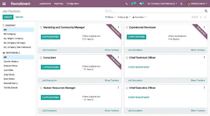 Utilisez la vue kanban et personnalisez les étapes de votre processus de recrutement : préqualification, premier entretien, deuxième entretien, négociation, etc. Obtenez des statistiques précises sur votre canal de recrutement.